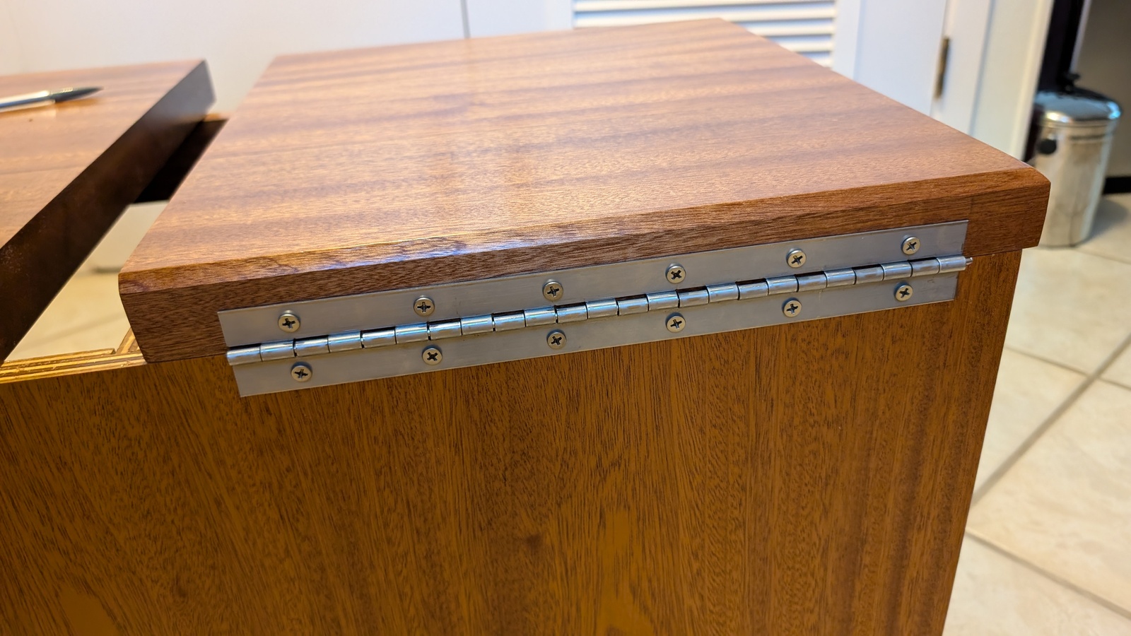 Recycle bin top piano hinge installed